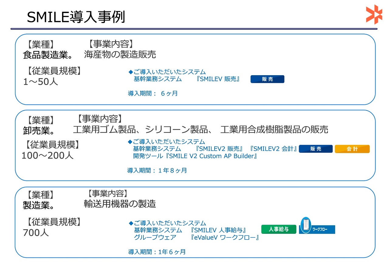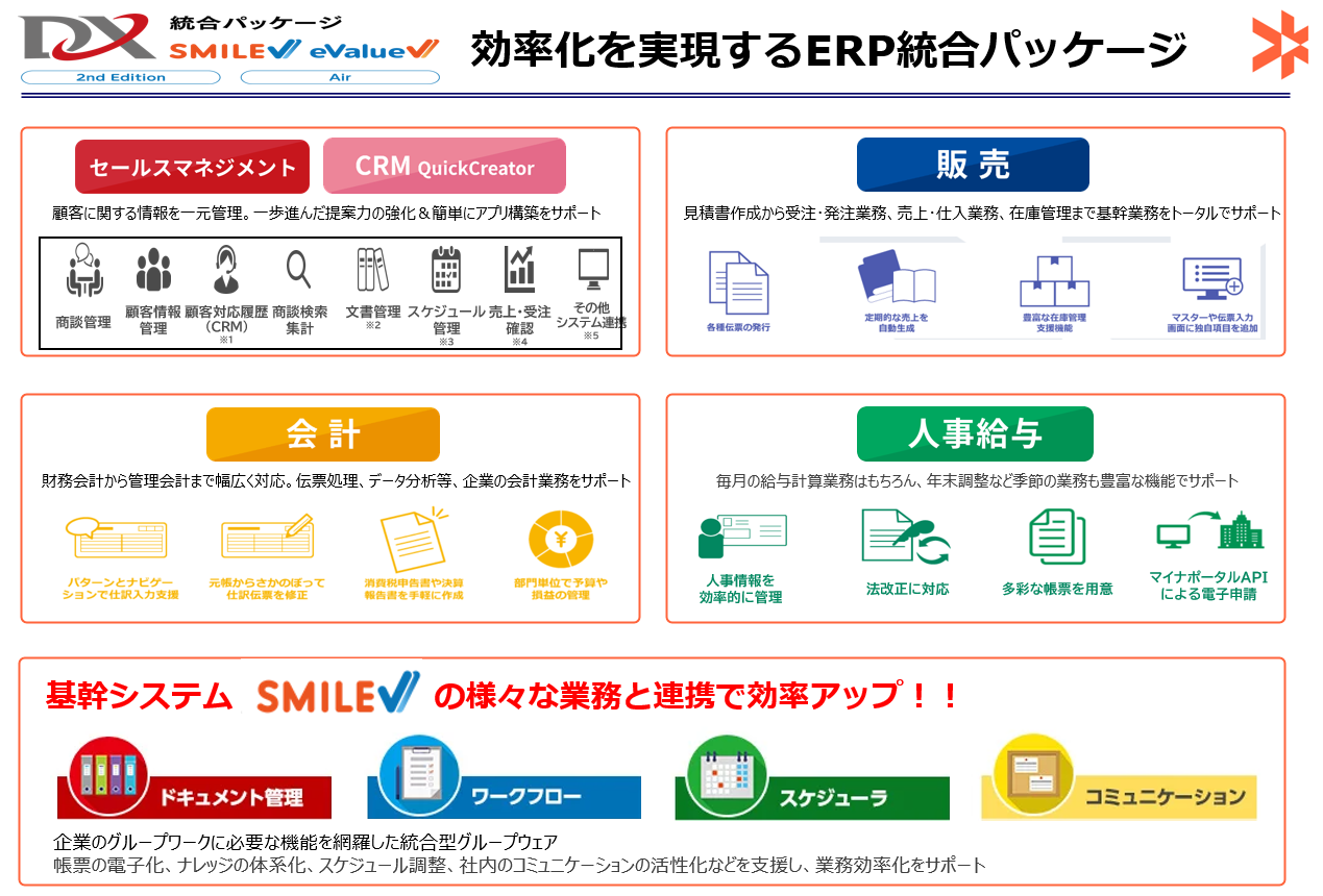業務に必要なパッケージシステムを選定し お客様のニーズに合わせてカスタマイズ開発しご提供。ERPパッケージSMILE・eValueの導入事例をご紹介